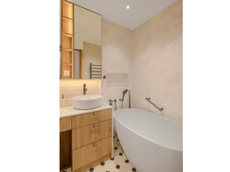 Itโs nice to have a feature wall โ for this one, we used a handmade clay tile. The floor has an Italian Chester tile with a border, and we added a wood-coloured cabinet for a warm feel. We also included a handmade sink and Corian countertop for softness.