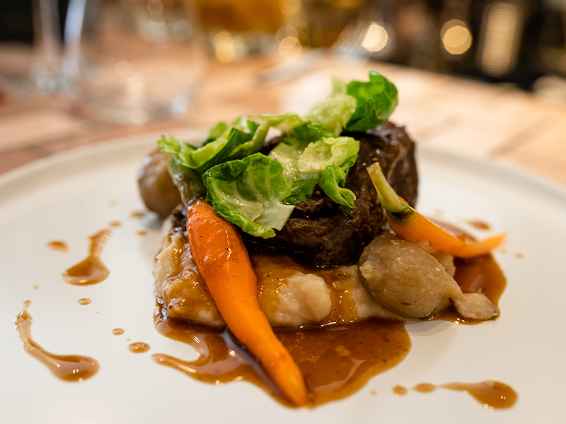 Other starters include a smoked herring potato salad, aubergine confit ravioli and a pâté en croûte that creatively combines pork, smoked eel, foie gras and pickles in pastry. You can also splurge on caviar and blinis, which comes with two glasses of champagne.