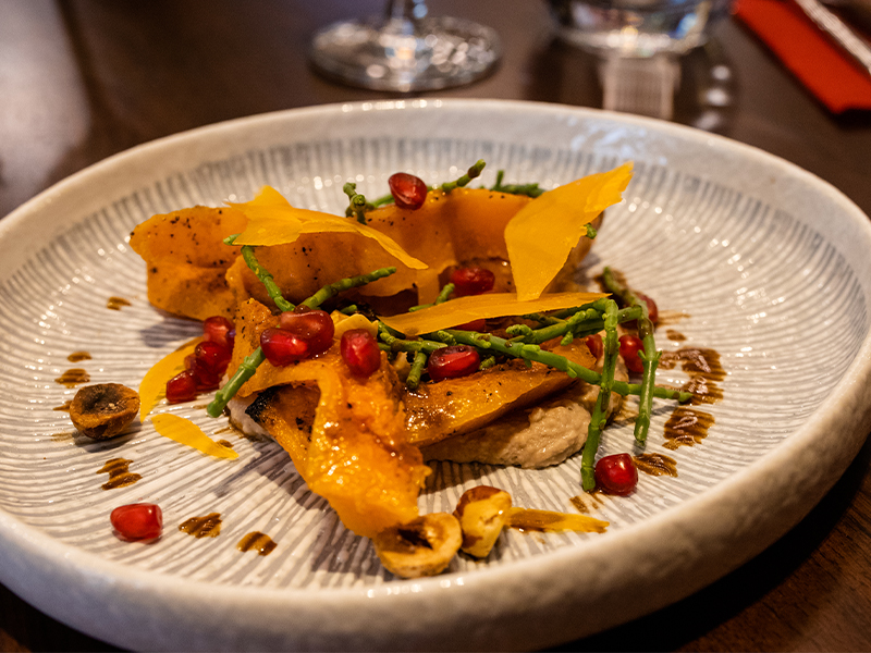Cocktails with scintillating citrus and opulent tea soon land on our table, as does some wonderful house-baked bread. The wine pairing throughout the evening also proves to be a triumph. What’s more, the open kitchen is pure theatre. Chef Franckelie Laloum is busy bantering with his team and their joie de vivre comes across in every plate.