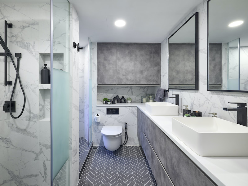 “I was also very excited to work on this project because we had great clients who saw our vision of making the space lighter and brighter, and home design more modern, comfortable and kid-friendly, but also sophisticated enough for the adults to have parties and gatherings. One of my favourite rooms is the boys’ bathroom. We ripped out the outdated tub and sinks and put in two showers, two sinks and four dedicated drawers in the vanity – one for each boy to keep his own toiletries. We used a cool colour palette of greys, whites and concrete with matte black fixtures. I’m also really pleased with how the floor turned out: charcoal black tiles set in a herringbone pattern.”