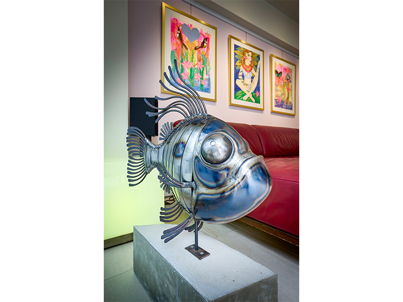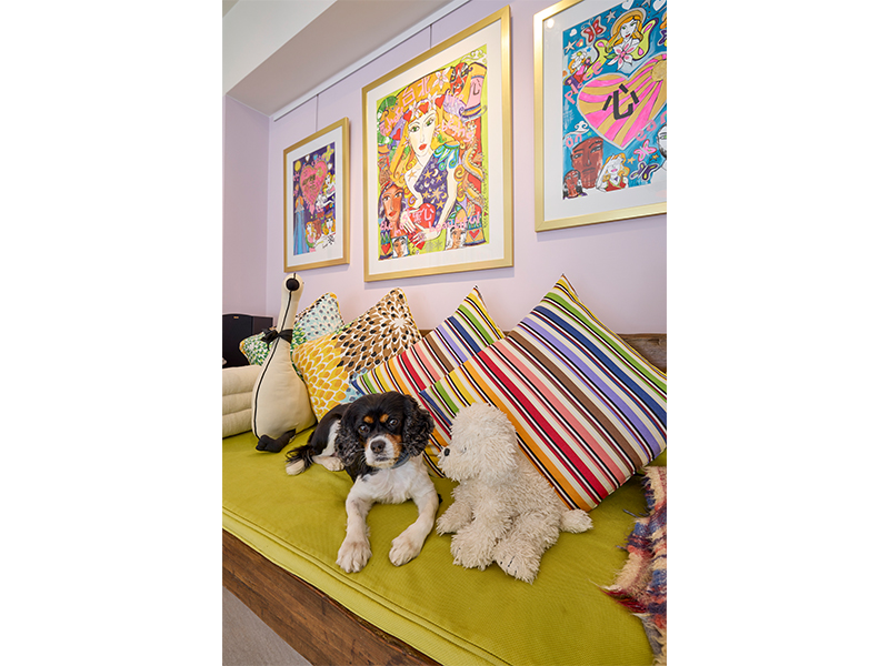 The split-level villa offers stunning sunrise views of Clearwater Bay from its roof. Inside, the home is set up for entertaining, with a vintage drinks trolley and a striking open-plan kitchen-dining area. Kate’s art is displayed on every wall too – it’s bright, cheerful and welcoming, matching her personality.