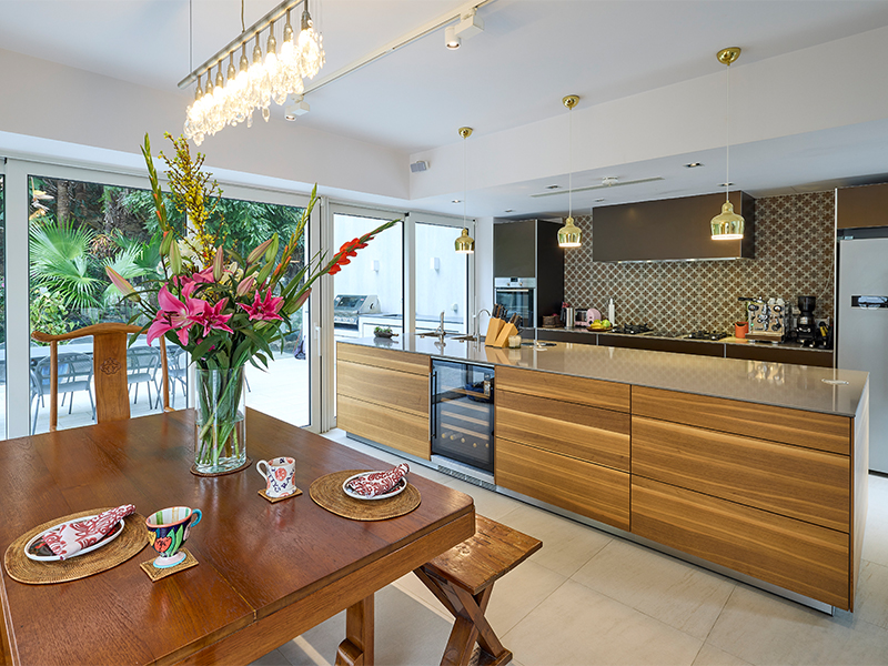 We have a beautiful vintage dining table that we bought in Singapore and above it is an iconic crystal chandelier from Sweden – it’s amazing; I hand-carried it from London. My art is everywhere in the house; it makes the place so lively and unique. We also have a beautiful custom-made glass vitrine that John designed and which houses all of our lovely glasses.