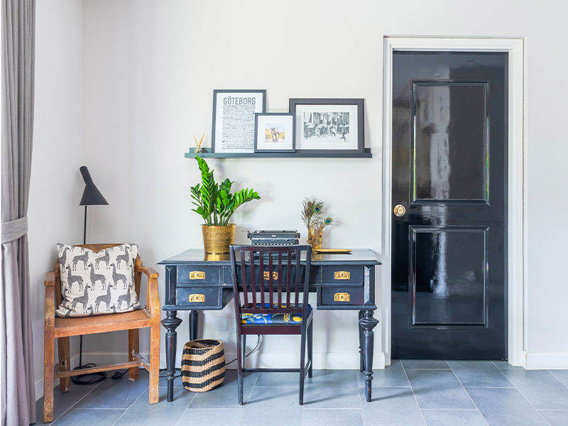 Meanwhile, the desk and chair at the entrance are flea market finds from Sweden. “I painted them, changed the handles and re-upholstered the seat as a little project,” says Lisa. “The lamps and rugs are also from Sweden.”