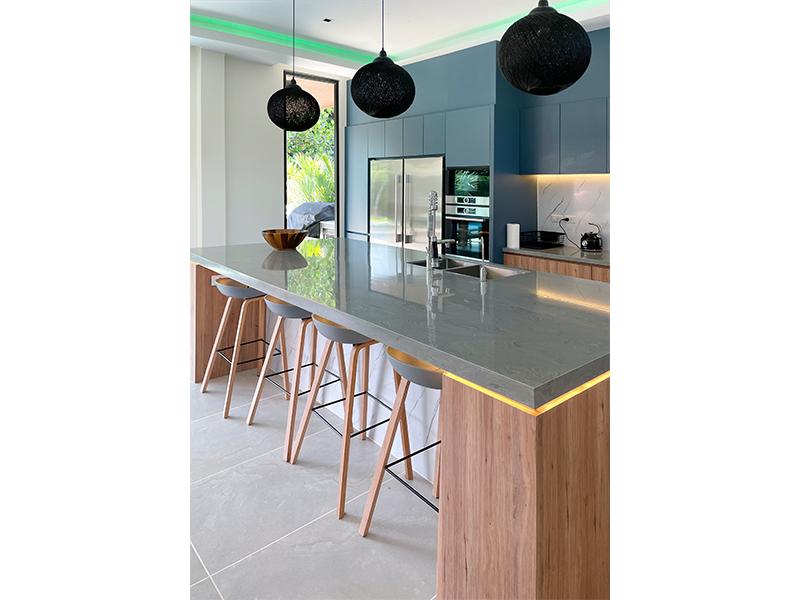 All the main living spaces have colourful LED lights hidden in ceiling troughs and we have a gorgeous chandelier in the staircase that we sourced in China and modelled on one that my husband loved from the bar at the Park Hyatt in Ho Chi Minh City, Vietnam. The staircase is oversized and creates a sense of grandeur. Along with the games room on top, we also have a play area and kids’ reading area at the bottom.