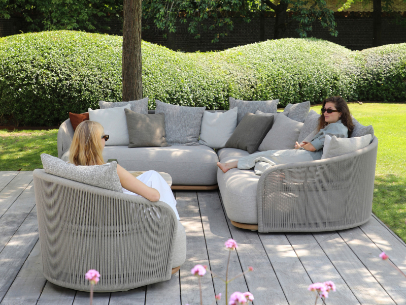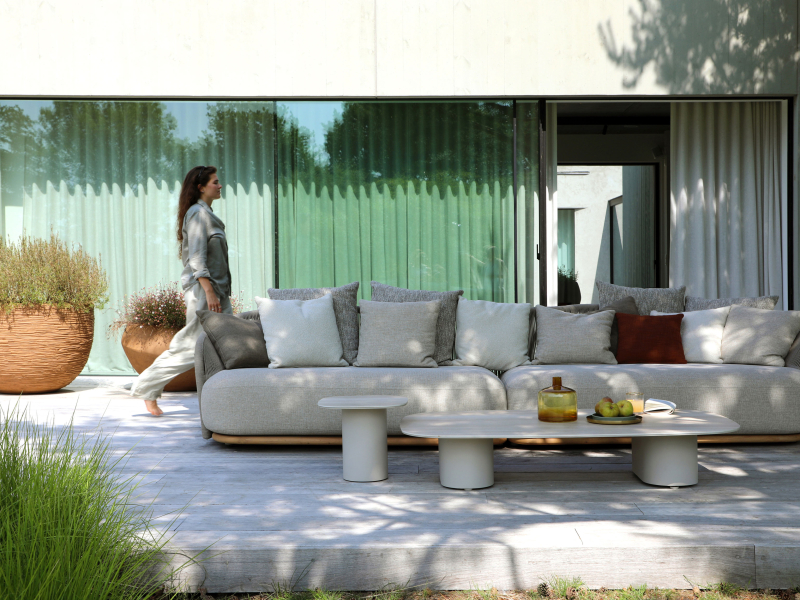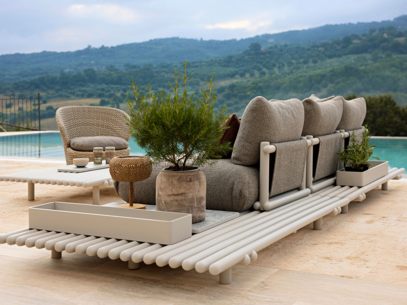High-end design harmonises with effortless comfort in the Wave collection. These pieces embody the fluidity of motion through their bold, sculptural form, inviting you to unwind in style. Designed for deep relaxation, this outdoor furniture line combines modular versatility with an elevated aesthetic. Deep, comfortable seats are adorned with loose back cushions, while an innovative double-face backrest adds volume and visual depth. The powder-coated aluminium frame features a sophisticated Mocha hue and is accented with teak.