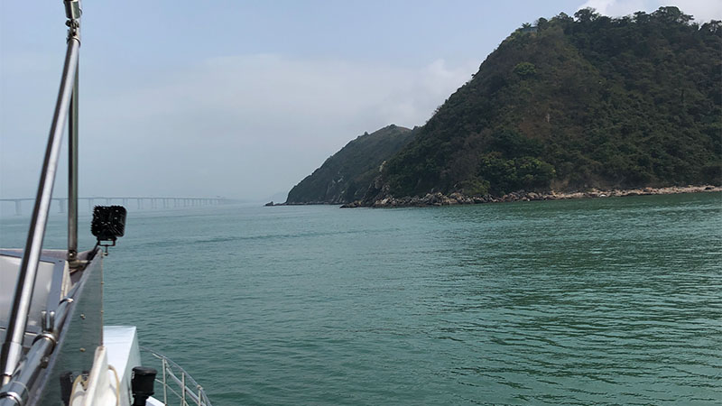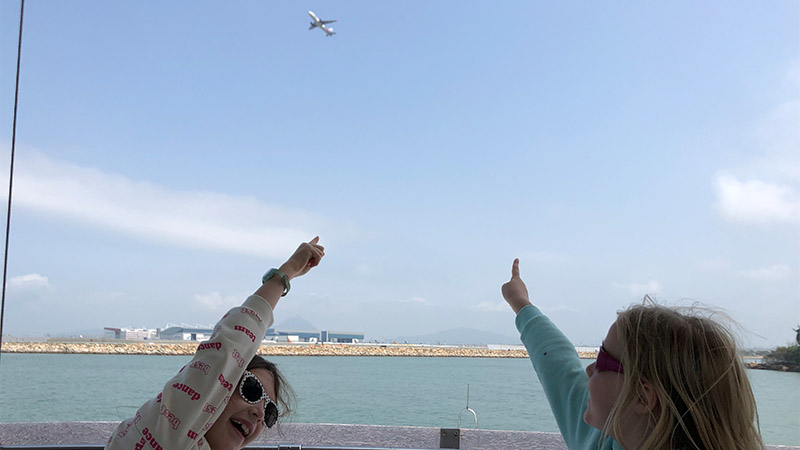 As we sailed out of Tung Chung, we saw the huge Macau-Zhuhai Bridge. There were men fishing on the stilts of the bridge and we went to sit on the upper deck to get a better view. We sailed right along the runway and noticed how busy the airport is. The water is definitely an interesting way to see the airport. We watched a lot of planes taking off – they were so noisy!