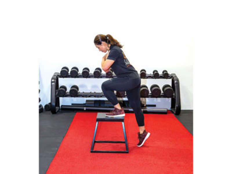 1. Begin with both feet placed firmly on a box. Start by stepping down with your right foot, only allowing the tip of your toes to lightly touch the ground.