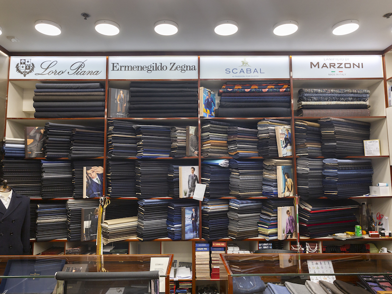 The exclusive collections of cottons, linens, superfine wools, worsted wools and cashmere blends are sourced from prominent names such as Marzoni, Ermenegildo Zegna, Nino Cerruti, Gianni Versace, Givenchy, Valentino, Scabal, Dormeuil, Fintex, Holland & Sherry, Vitale Barberis Canonico and Loro Piana.