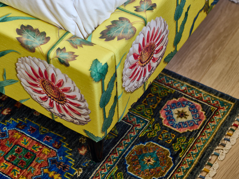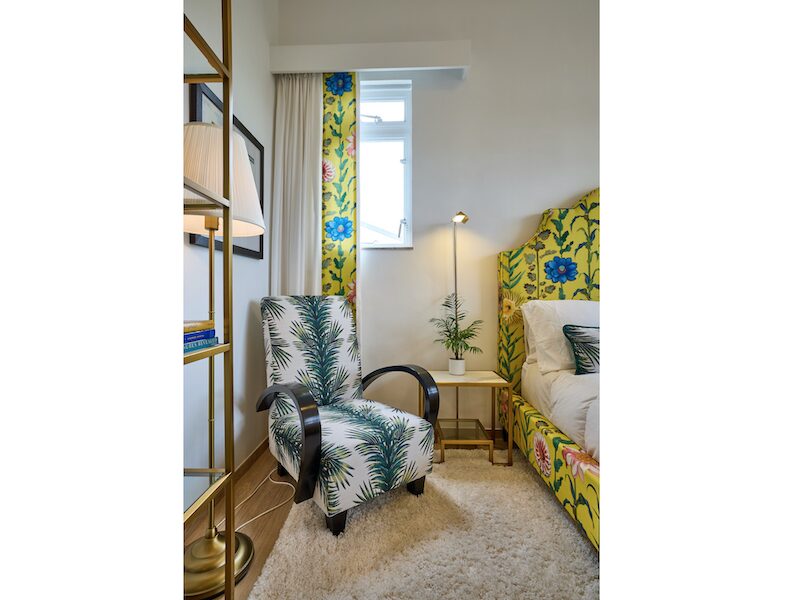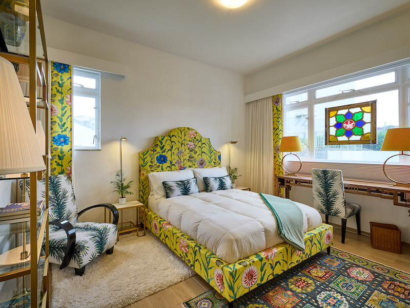 In particular, these two companies helped Nancy to be a bit bolder in choosing fabrics, especially prints, as in the past she had tended more toward solids. “Doris from Avant Garde custom-made the gorgeous yellow guest bed, and spent hours cutting the fabric so that the flowers ‘grow’ up the sides!”