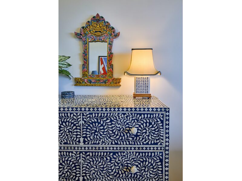 There are memorable pieces of furniture, too – not least the antique Indian charpoy daybed, which sits in front of a large picture window in the living room. Nancy says it’s one of her favourite places in the home. “I filled it with cushions, and it is so comfortable – I call it my ‘perch’. I like to prop myself up there at all times of day, but most especially at sunset to watch the lights come up over the harbour and city.”