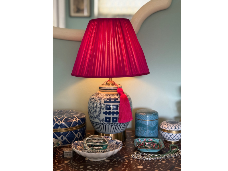 You can also select from a sumptuous pure silk lamp shade in a choice of signature colours: Magenta, Teal and Navy & White. There’s also a new and gorgeous natural Raffia shade for a more laid-back look.