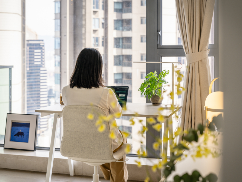 We love including smart lighting systems that allow you to easily adjust the atmosphere throughout the day, whether you’re working, taking calls or winding down. A small desk plant adds life to the space and offers a visual break from screens. Thoughtful objects like a paperweight, a fountain pen or a leather desk pad can also make the workday feel more intentional and considered.
